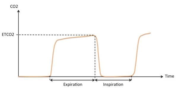 Most devices provide a waveform (see Figure 3) representing partial pressure of CO2 in the air over time. Some devices only give the value of partial pressure of CO2 at the end of expiration (ETCO2). Analysis of the waveform is important as it allows identification of issues with the machine (leaks, dysfunctional valves, etc.) or the patient (respiratory obstruction, asthma, dead space, etc.). It can also be used to adjust oxygen flow when using a Bain circuit or checking if the soda lime is exhausted. Finally, if the waveform is not normal, ETCO2 and respiratory rate value may be false.
