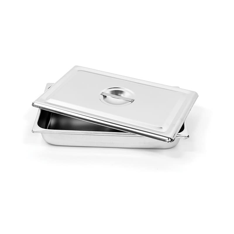 Ces contenants et plateaux sont disponibles en différentes tailles, avec ou sans couvercle encastré, tous fabriqués en acier inoxydable.