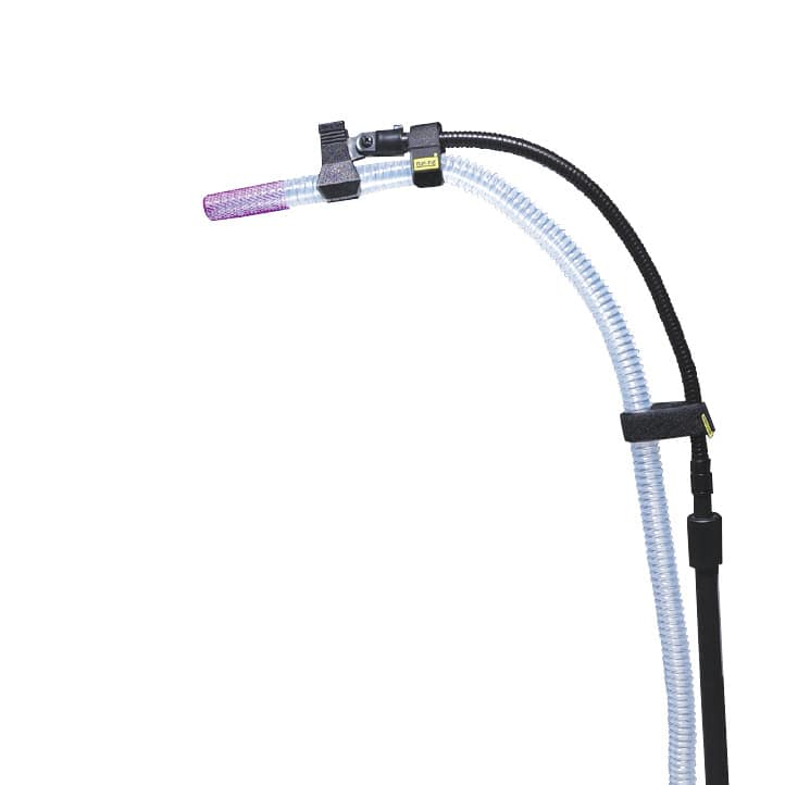 This arm stand is used to hold the smoke evacuation tube during electrosurgical procedures.