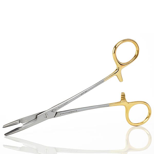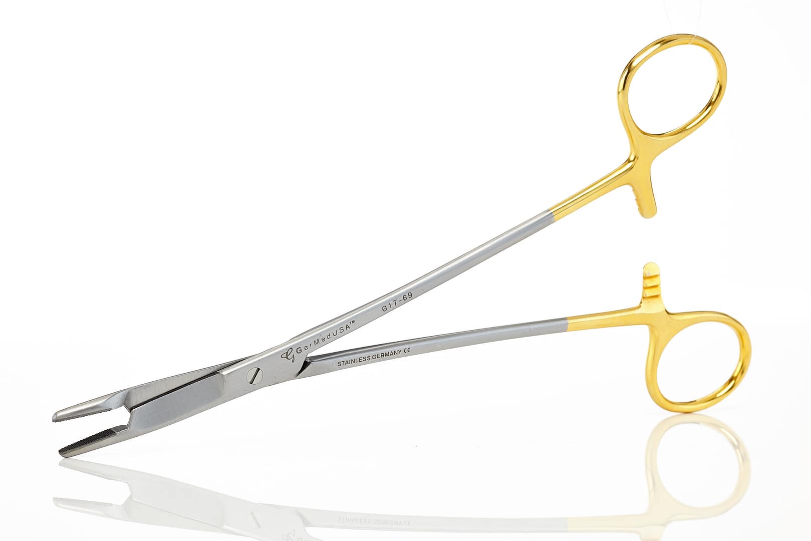 Olsen Hegar needle holder scissors combination has a German stainless body that is autoclavable. These instruments have Tungsten Carbide inserts in their serrated jaws to provide optimal grip during needle holding. They have gold finger-ring handles for better identification. Available in a variety of lengths.